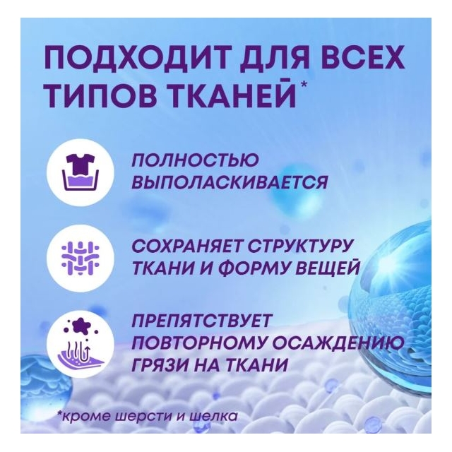 Эффективен даже в прохладной воде и на коротких циклах стирки. Полностью выполаскивается и не оставляет разводов.