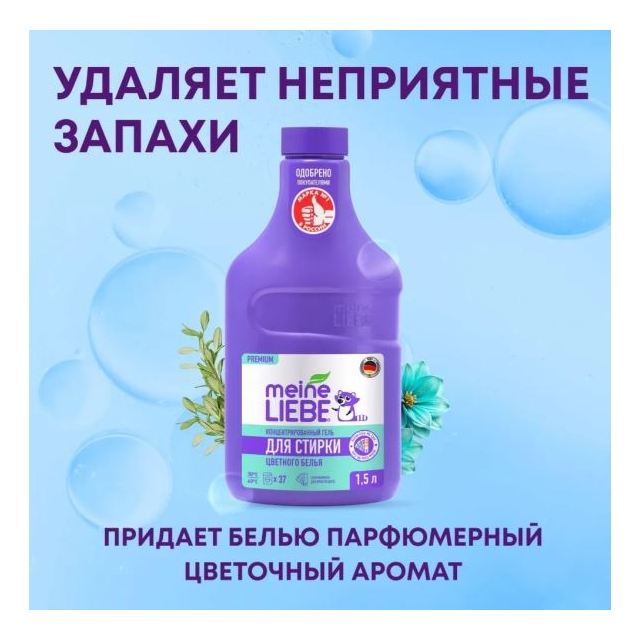 Гель для стирки Meine Liebe подходит для изделий из цветных синтетических, хлопчатобумажных и льняных тканей, а также тканей из смешанных волокон.