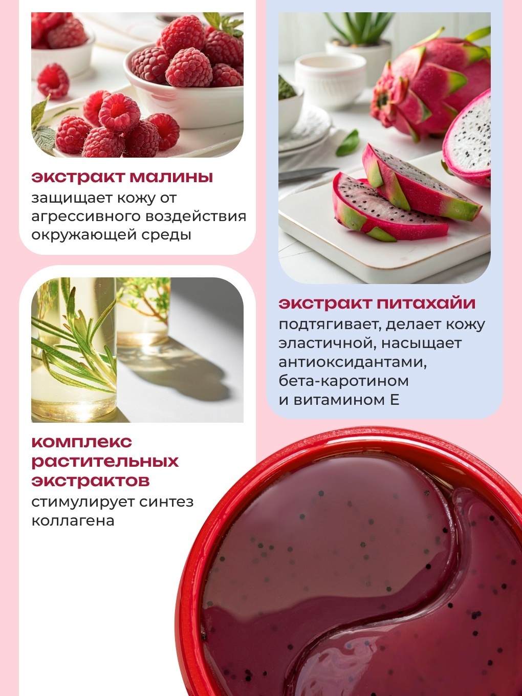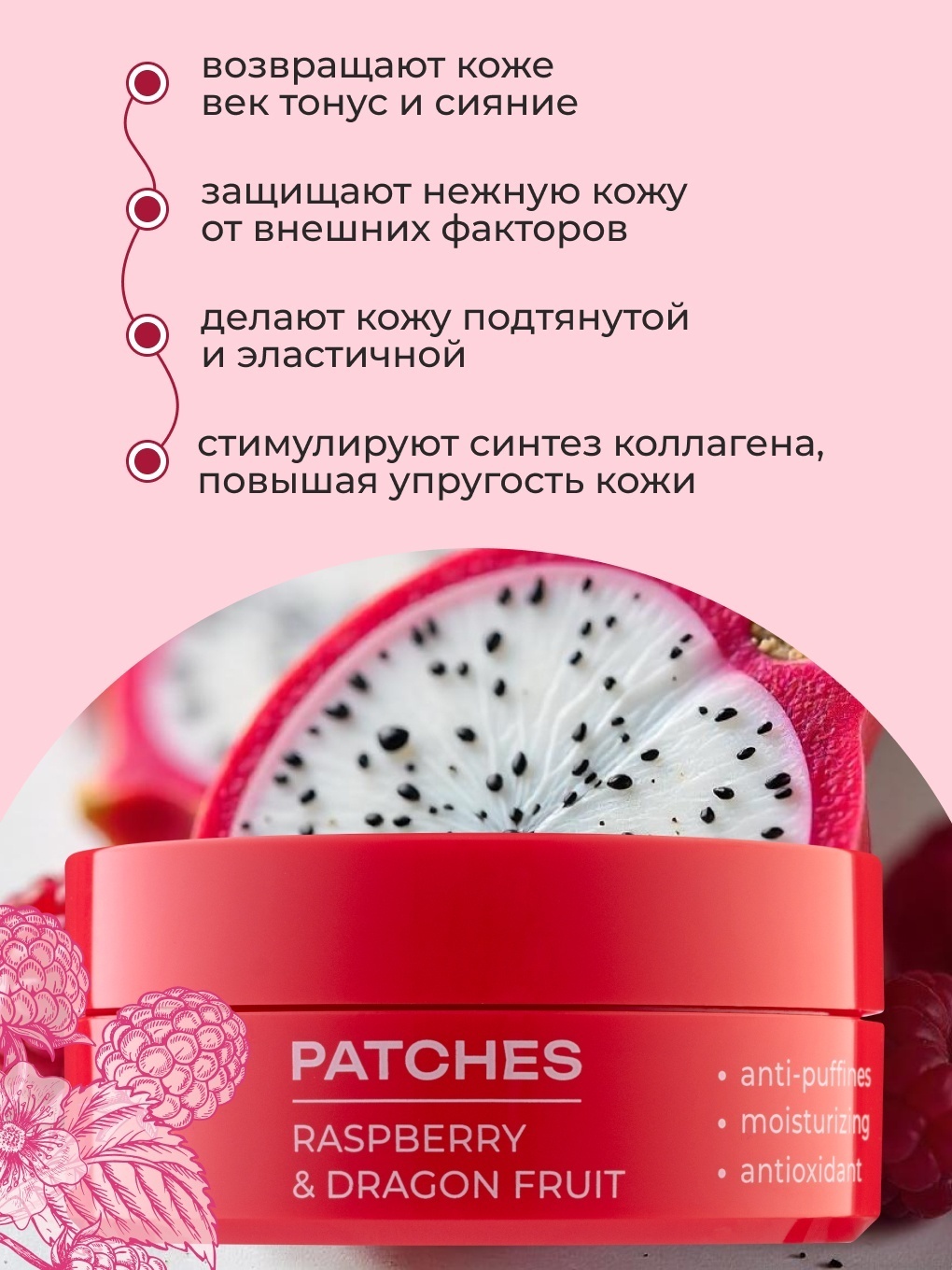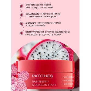 Гидрогелевые патчи для глаз с экстрактами малины и питахайи возвращают уставшей тонкой коже век тонус и сияние. Экстракт малины защищает нежную кожу от агрессивного воздействия окружающей среды. Экстракт питахайи благодаря высокому содержанию антиоксидантов, витамина Е и бета-каротина делает кожу более подтянутой и эластичной. Комплекс растительных экстрактов стимулирует синтез коллагена, что делает кожу более упругой. Твоя кожа под глазами будет выглядеть свежо и без следов усталости.
