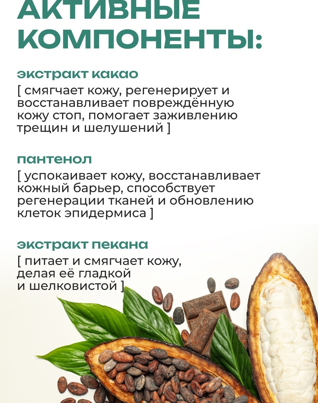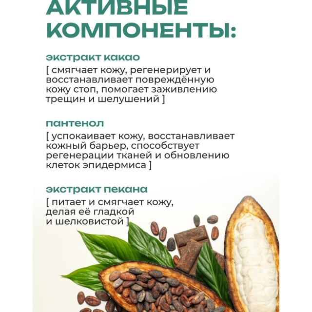 Питательный крем для ног с экстрактами какао и пекана обладает лёгкой невесомой текстурой, увлажняет кожу без чувства липкости, способствует заживлению трещинок и раздражений. Пантенол успокаивает кожу, восстанавливает кожный барьер, мочевина способствует обновлению кожи и делает ее мягкой. Благодаря компактному формату крем удобно брать с собой. Яркие упаковки и фруктовые ароматы заряжают хорошим настроением. Твои ножки под надёжной защитой