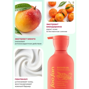 Гель для душа с ароматом мандарина и манго бережно и эффективно очищает кожу, оставляя на теле приятный ненавязчивый аромат. Мягкие ПАВ бережно очищают и не сушат кожу. Экстракт манго и экстракт апельсина дарят коже естественное сияние и оказывают антиоксидантное действие. Пантенол в составе успокаивает кожу.