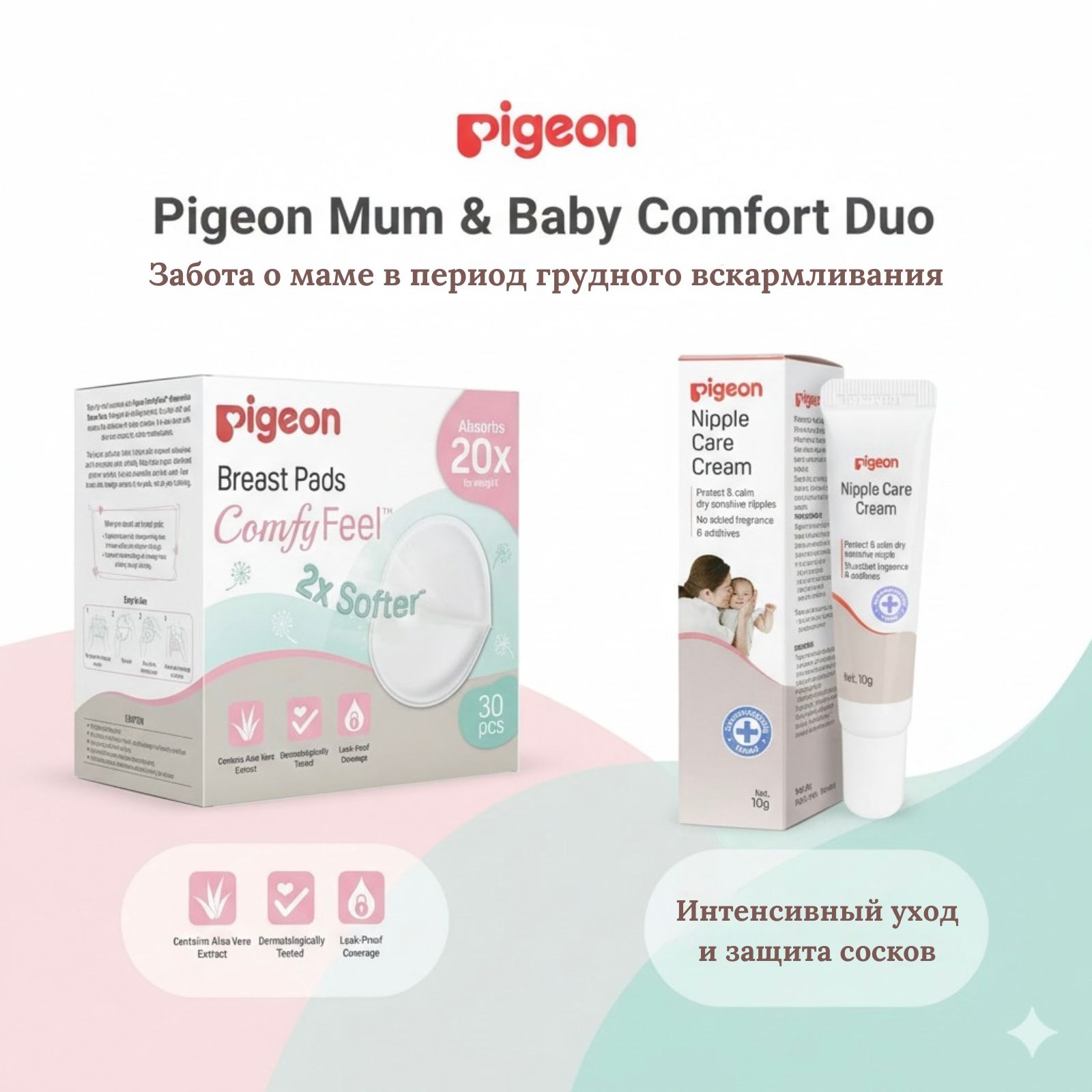 Набор Pigeon Mum & Baby Comfort Duo — выгодное и практичное решение для мам в период грудного вскармливания. В комплект входят два незаменимых продукта: крем для сосков Pigeon Nipple Care Cream и ультрамягкие вкладыши для груди Pigeon Comfy Feel с алоэ вера.
