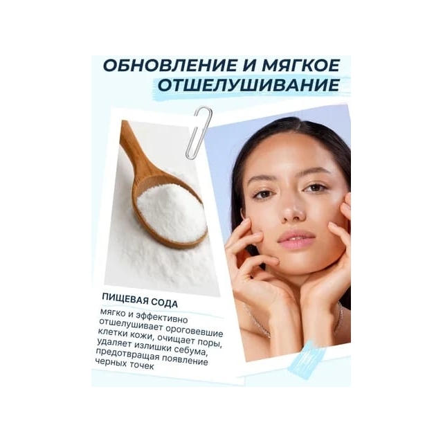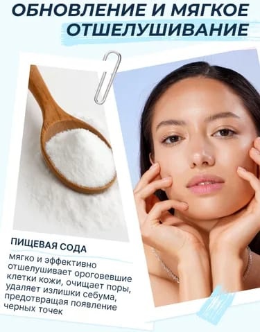 Скраб с частичками соды очищает поры, отшелушившая омертвевшие клетки и помогает избавиться от черных точек. Скраб выравнивает текстуру кожу, делает кожу гладкой и сияющей. Способ применения: Нанесите небольшое количество на влажную кожу, мягкими массирующими движениями распределите его по коже, смойте тёплой водой. Используйте скраб 1-2 раза в неделю.