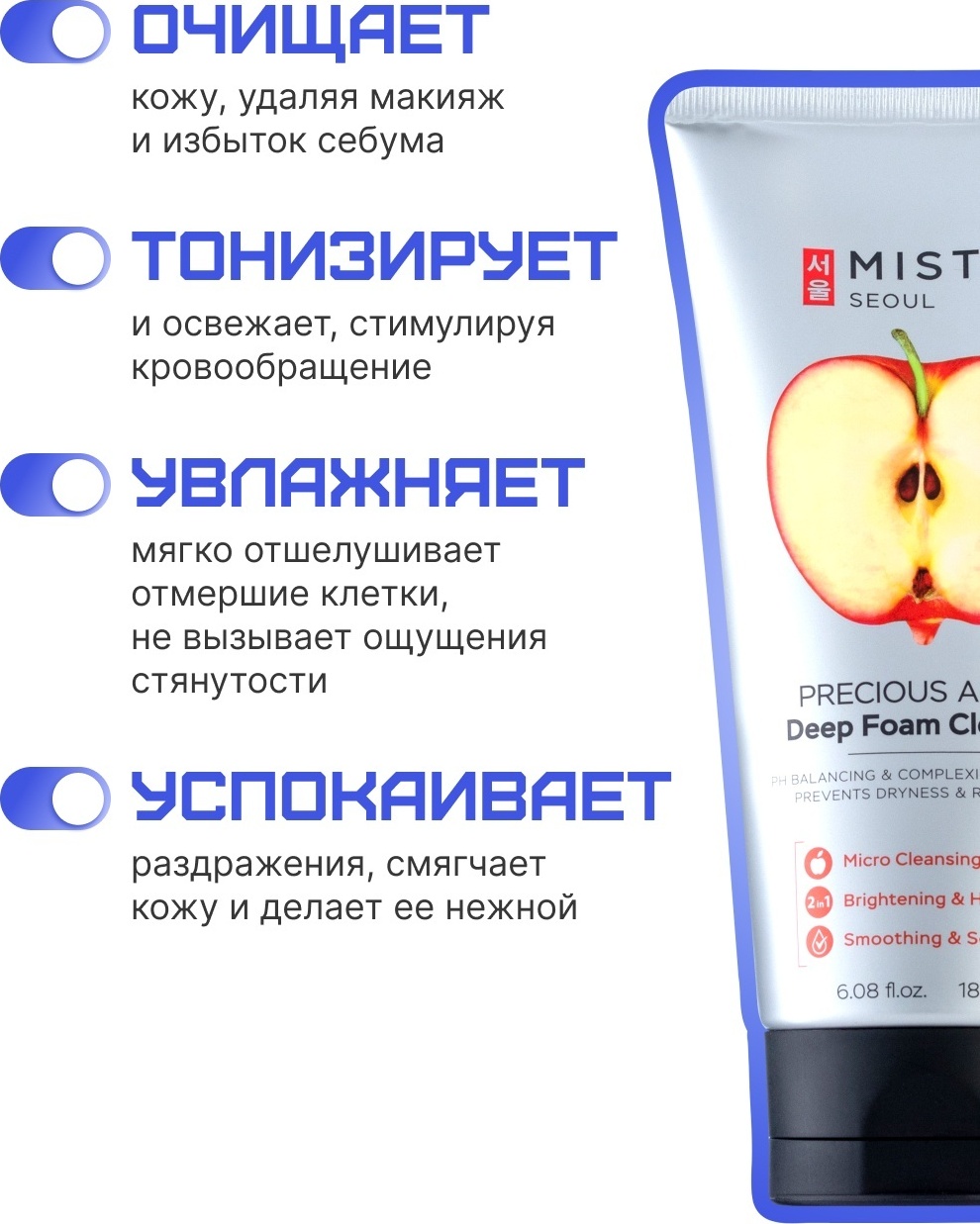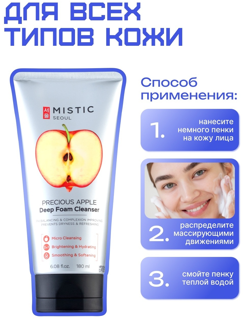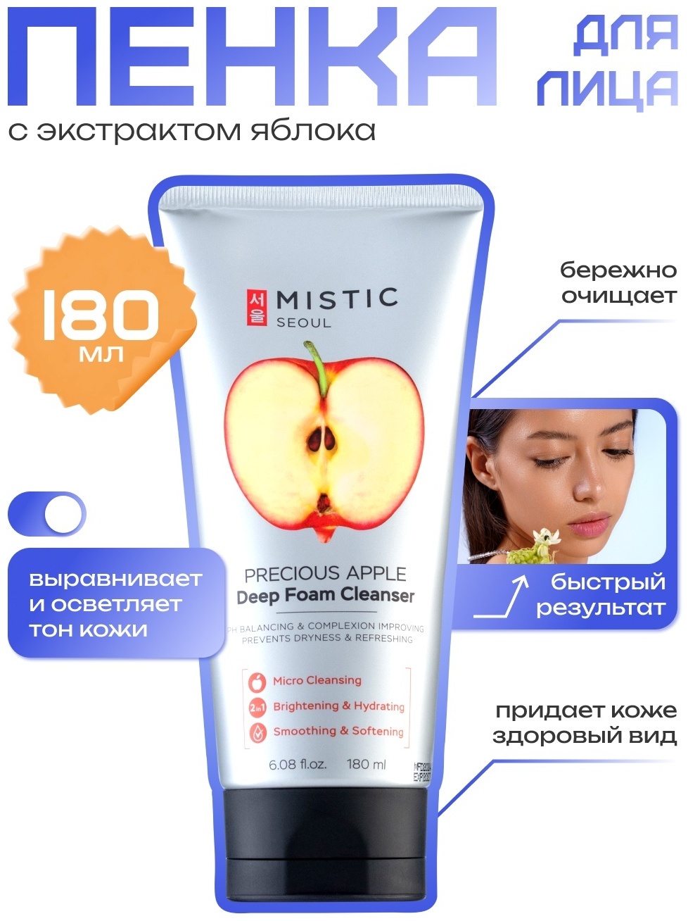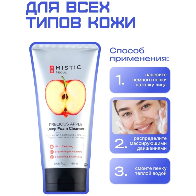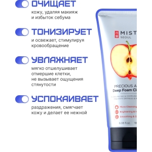 Глубокоочищающая пенка для умывания с экстрактом яблока эффективно удаляет загрязнения и остатки макияжа. Компоненты, входящие в состав пенки, выравнивают тон, питают и увлажняют кожу. В результате ваша кожа приобретает свежий и здоровый вид.
