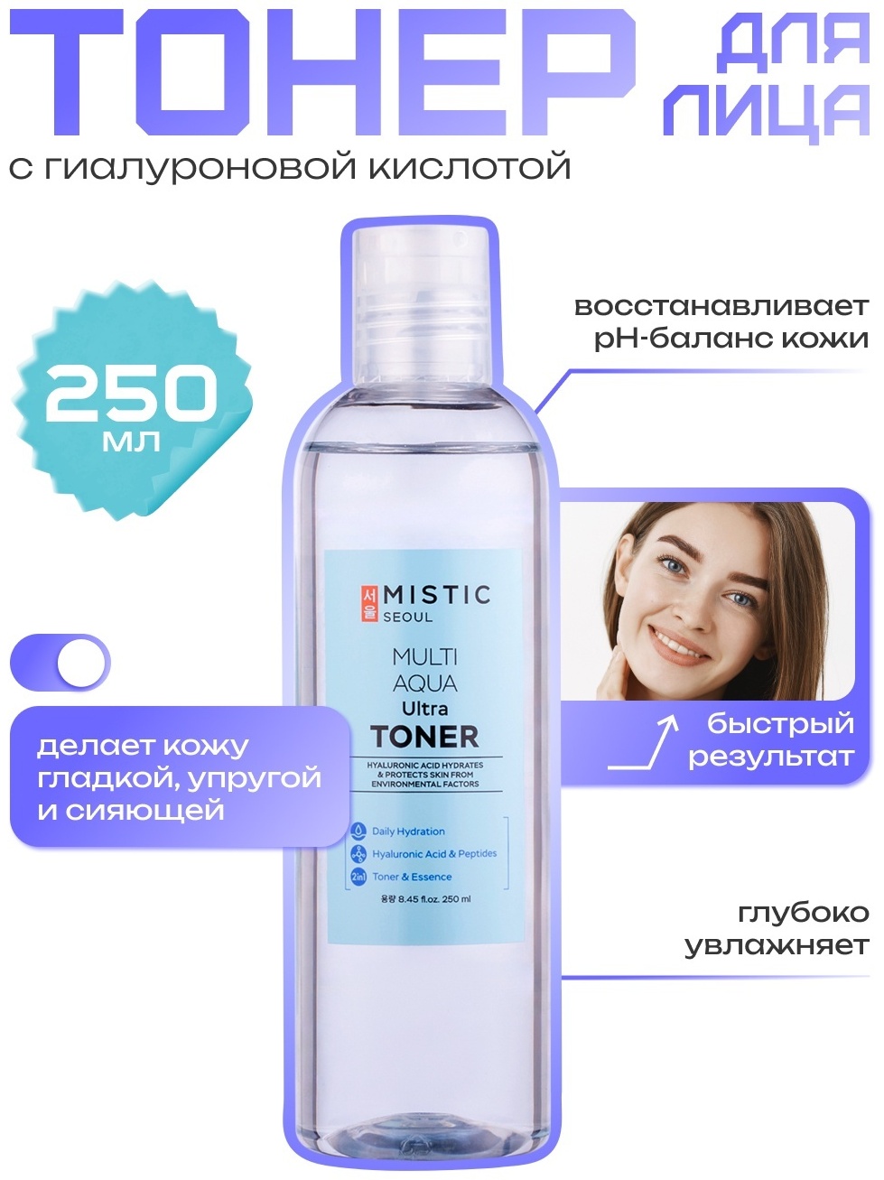 Влажняющий тонер MISTIC с гиалуроновой кислотой насыщает кожу влагой, восстанавливая ее эластичность. Содержит мощный комплекс из 6 типов пептидов, экстрактов фруктов и ягод, которые тонизируют, укрепляют и способствуют омоложению кожи, придавая ей здоровый и свежий вид. Тонер подходит для всех типов кожи, обеспечивая длительное увлажнение и защиту от негативных внешних факторов. Идеален для увядающей кожи, склонной к избыточной сухости.