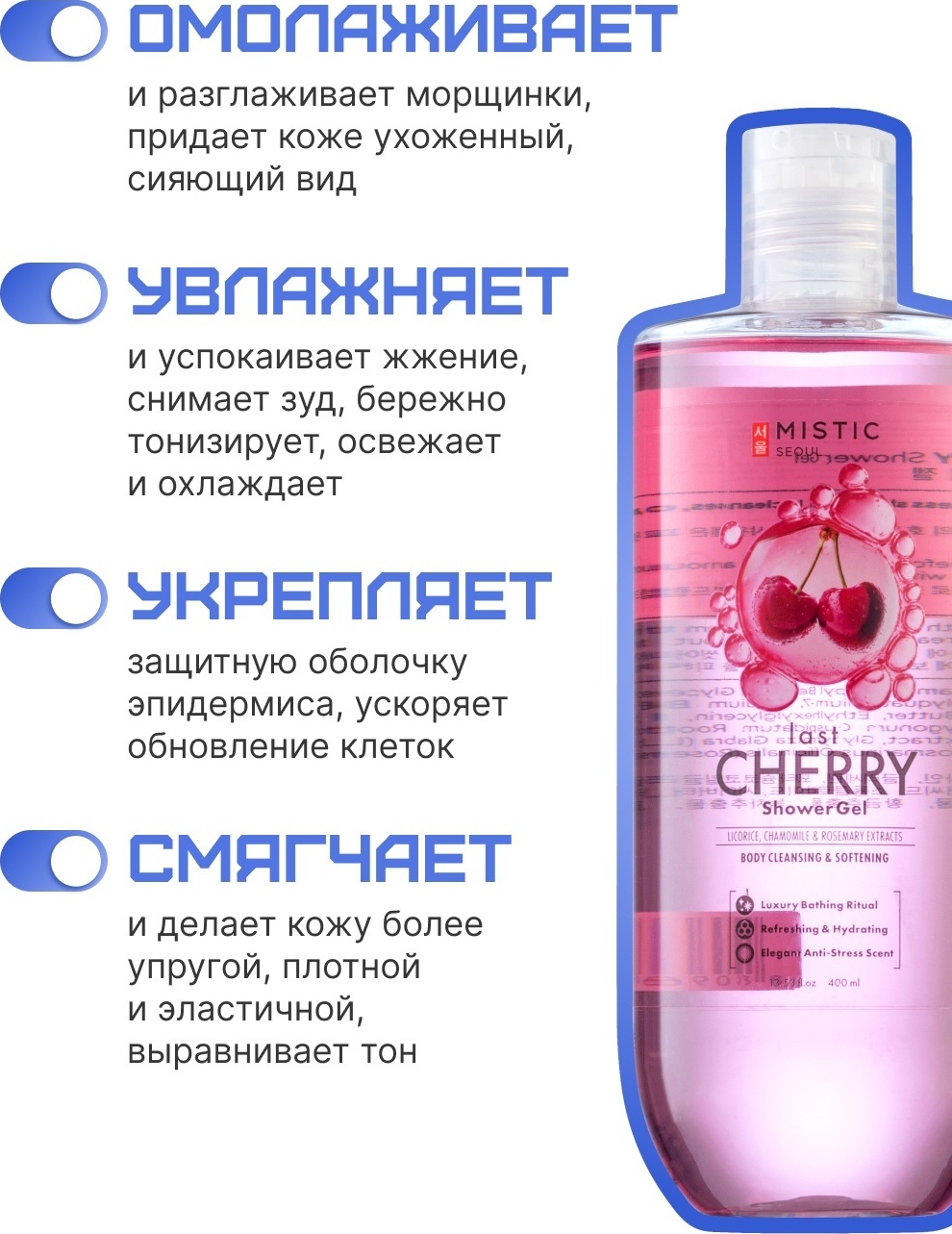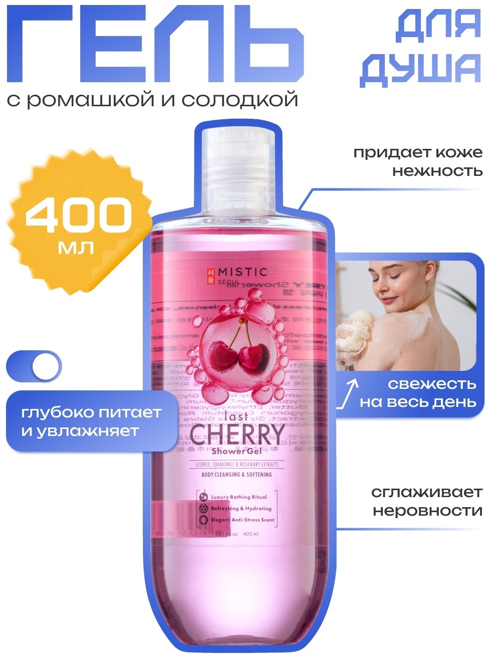 Увлажняющая формула геля для душа MISTIC насыщают кожу витаминами и минералами. Входящие в состав экстракты ромашки и солодки очищают, успокаивают и увлажняют кожу, делая ее мягкой, нежной и гладкой. Приятный аромат вишни дарит ощущение свежести. Подходит для ежедневного использования.