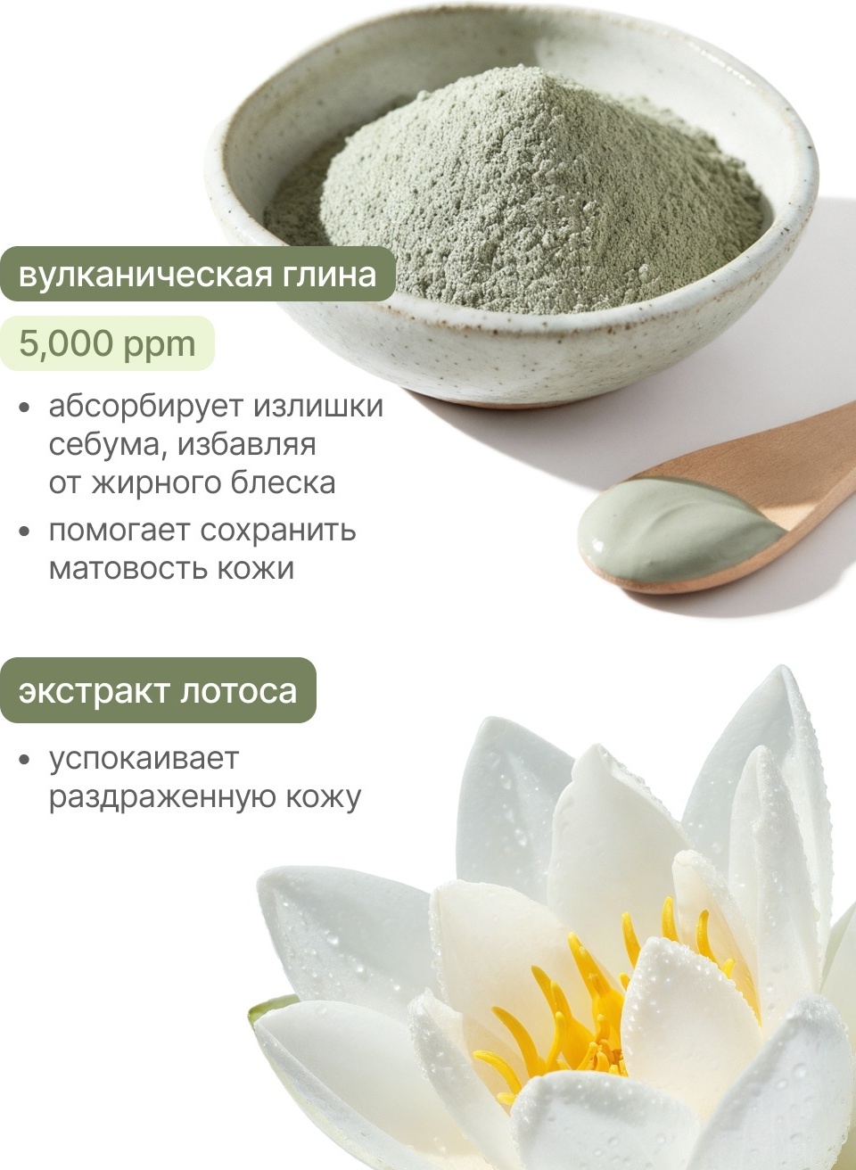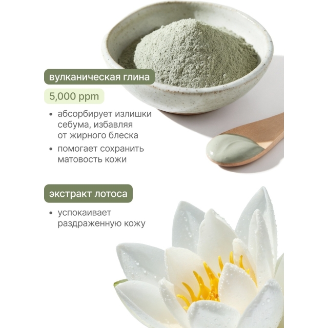 Крем для лица направлен на увлажнение кожи склонной к жирности. Ниацинамид укрепляет защитный барьер, а вулканическая глина помогает регулировать излишки себума. Экстракт лотуса оказывает мощный успокаивающий эффект. Комплекс из центеллы и пантенола успокаивает раздражения, ускоряет заживление, увлажняет и смягчает кожу. Легкая текстура средства быстро впитывается и не оставляет жирности на коже.