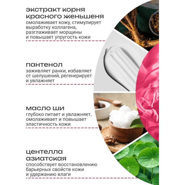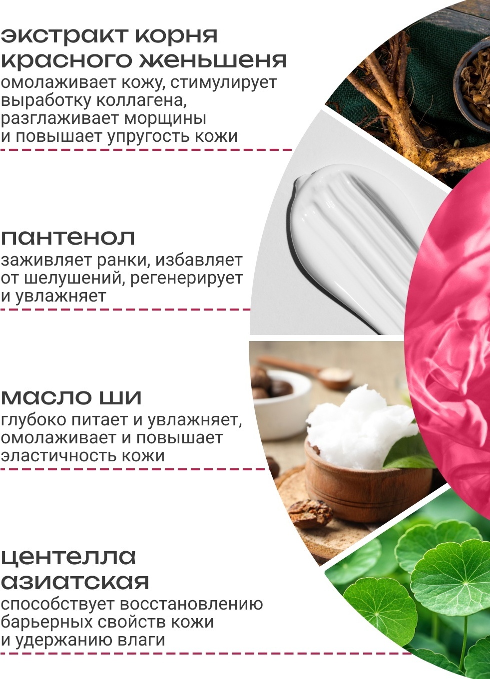 Питательный крем для рук с экстрактом красного женьшеня повышает эластичность кожи и помогает сохранить её упругость. Масла кокоса, семян подсолнечника и ши интенсивно увлажняют, питают и смягчают кожу рук. Галактомисис снижает зуд и раздражение, а пантенол успокаивает кожу, ускоряет регенерацию и способствует заживлению мелких повреждений. Аргинин стимулирует выработку коллагена, улучшая плотность и тонус кожи. Растительные экстракты обеспечивают комплексный уход, делая кожу рук мягкой, гладкой и ухоженной.