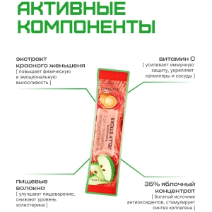 Меры предосторожности: Индивидуальная непереносимость компонентов. Продукт может содержать следы аллергенов (персика, сои, молока, пшеницы, арахиса и яиц). Перед использованием проконсультируйтесь с врачом при беременности или кормлении грудью. Не подходит для детей до 1 года. Состав: Яблочный концентрат, Фруктоолигосахарид, Пищевой желейный гель , Концентрат красного женьшеня 6-летней выдержки, Ароматизатор красного женьшеня, Стевия, Витамин С, Очищенная вода.