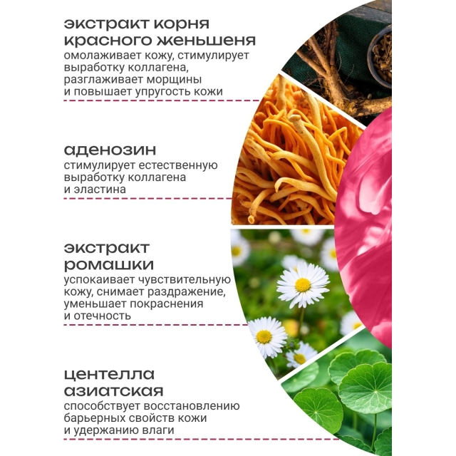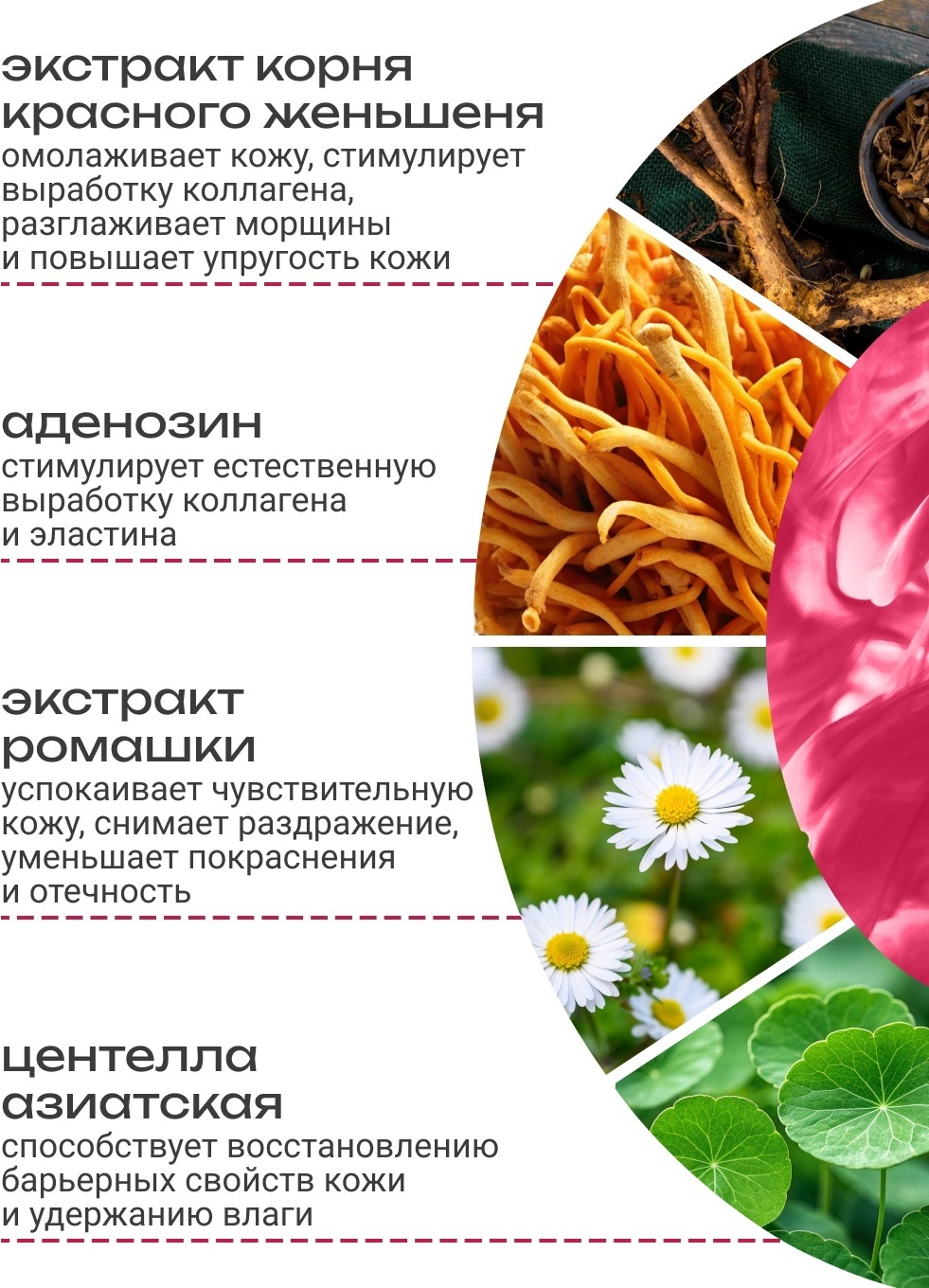 Увлажняющий дневной крем для лица, обогащенный экстрактом красного женьшеня, подтягивает и повышает эластичность кожи. Специальный пептид, входящий в состав, значительно сокращает глубину морщин. Экстракты сои, центеллы азиатской, корня солодки увлажняют, выравнивают тон, тонизируют и успокаивают кожу. Масло ши питает и смягчает кожу. Ваша кожа выглядит подтянутой, сияющей и здоровой.