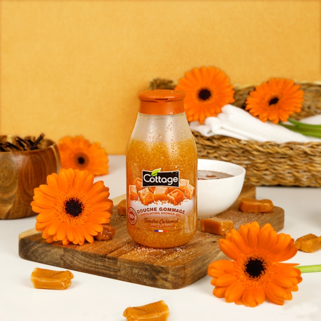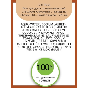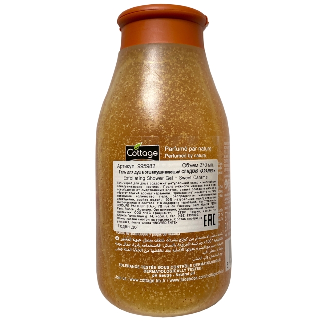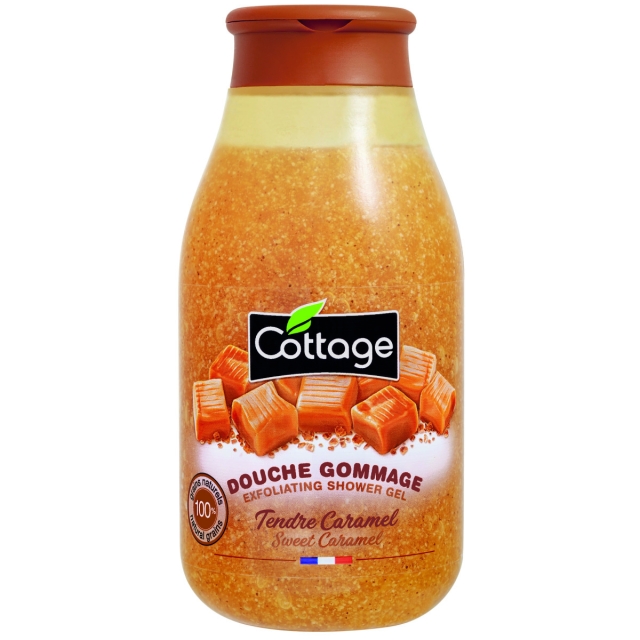 Cottage Гель для душа отшелушивающий Сладкая карамель 270мл Гель-скраб для душа содержит натуральный сахар и мельчайшие отшелушивающие частицы. После нежного массажа ваша кожа освободится от омертвевших клеток, станет особенно мягкой и обретет тонкий аромат карамели. 100% натуральные отшелушивающие микрочастицы в составе. Не содержит парабенов.Применение: нанесите на тело небольшое количество геля, распределите массирующими движениями, смойте водой.