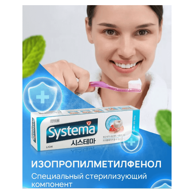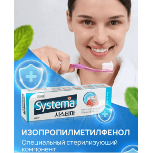 Описание: Лечебно-профилактическая зубная паста CJ LION Systema Ice Mint Ледяная прохлада предназначена для предотвращения пародонтоза, периодонтита и гингивита. Особенности: • Паста имеет усиленную антибактериальную формулу для контроля и защиты состояния десен • Антибактериальный компонент изопропилметилфенол (IPMP), проникая внутрь отложений на поверхности зубов, а также в самые труднодоступные зоны ― в слои зубного налета и в зубно-десновый карман, уничтожает бактерии, вызывающие воспаление десен и неприятный запах изо рта • Фторид натрия укрепляет структуру зубов, препятствует возникновению кариеса Состав: Изопрорилметилфенол(IPMP), глицирризинат калия двойной, фторид натрия силикатный, диоксид кремния стоматологического типа