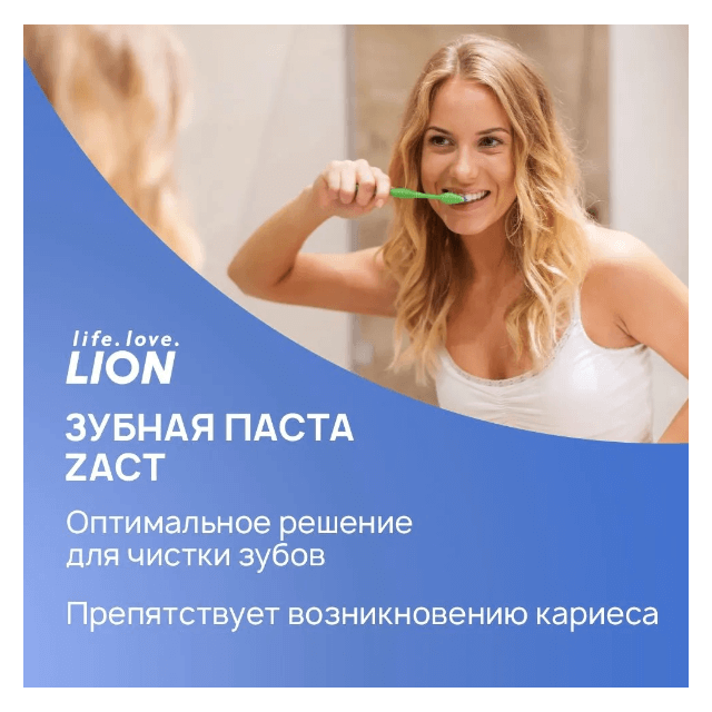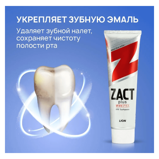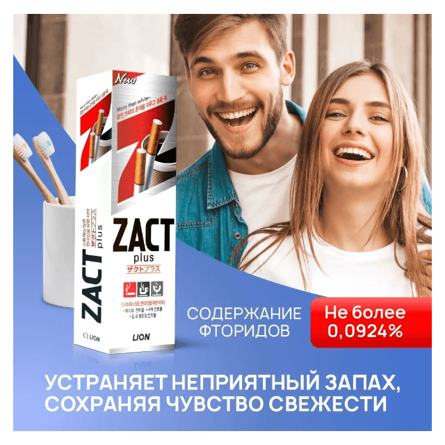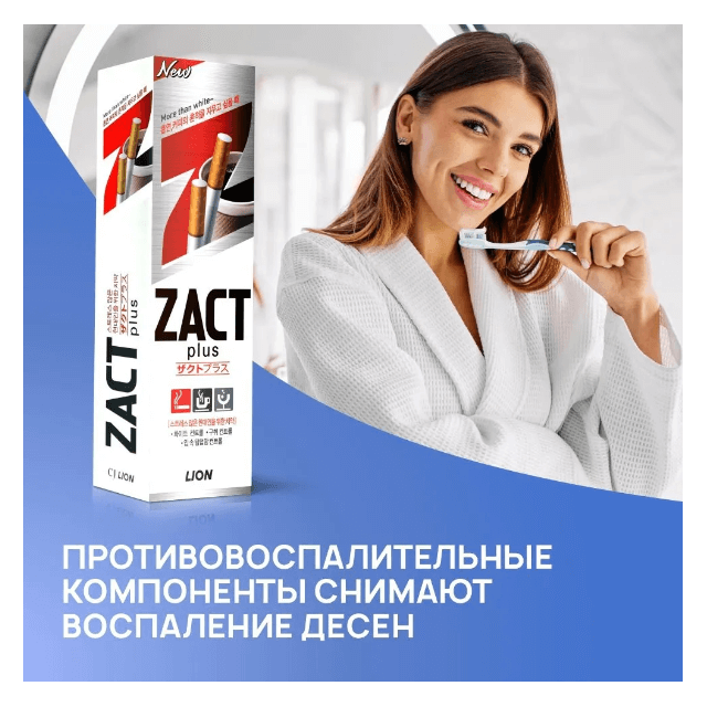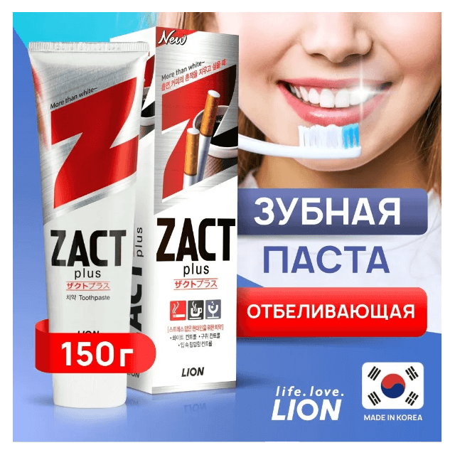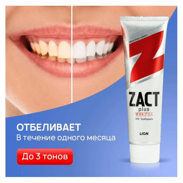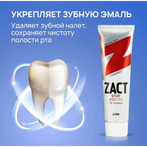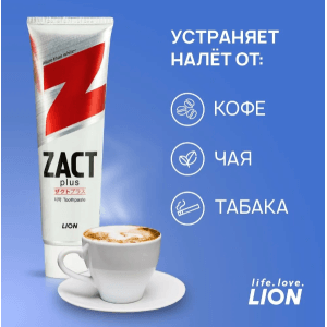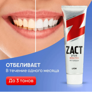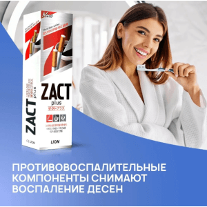 - Контроль за терпкостью во рту. После курения или принятия кофе во рту появляется ощущение терпкости. Почистите зубы зубной пастой Zact и привнесите свежесть и чистоту в полость рта, обретите потерянную красоту зубов вместе с пастой Zact.
