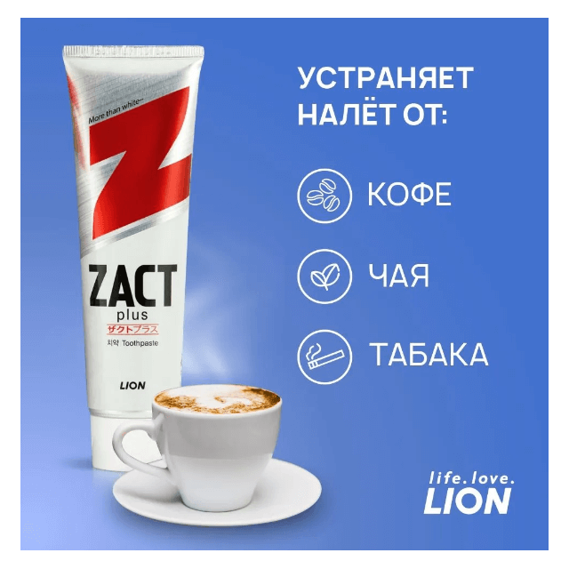 - Контроль белизны. Табак и кофе содержат вещества, которые при длительном воздействии способны накапливать на поверхности зубов специфический налет, что приводит к потере натуральной белизны зубов. Зубная паста Zact предназначена именно для таких целей – она помогает счищать кофейный и табачный налет с зубной поверхности.