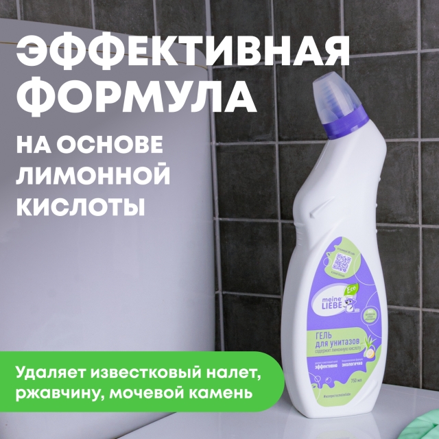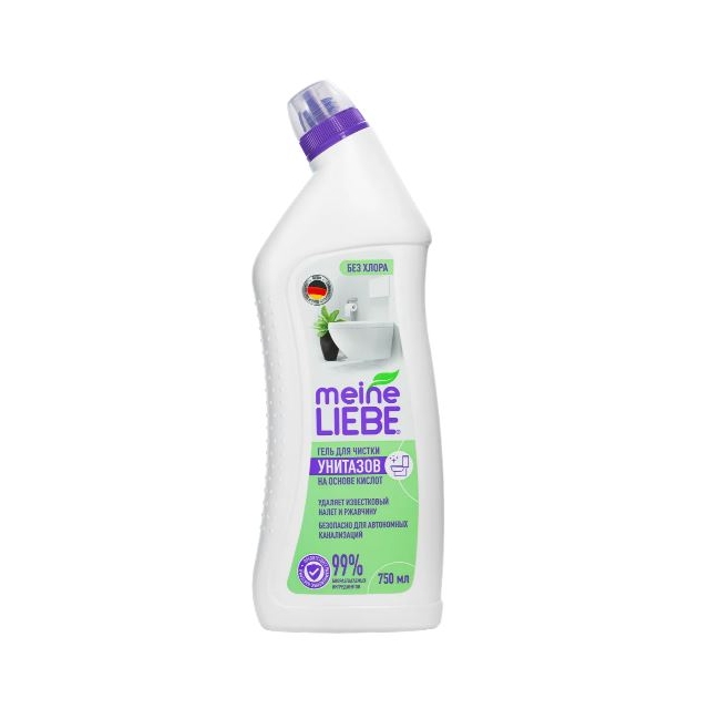 Экологичный концентрированный гель Meine Liebe предназначен для эффективной и безопасной очистки сантехники и других поверхностей ванной комнаты.