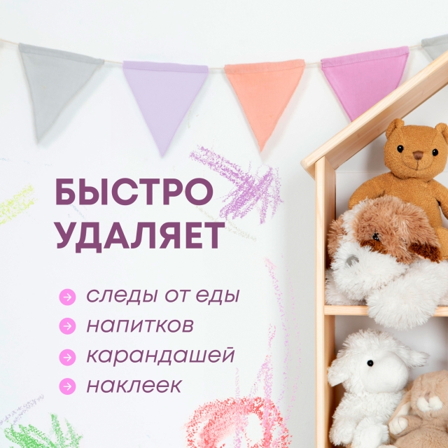 Эффективная, концентрированная формула позволяет сокращать расход средства, быстро удаляя загрязнения без изнурительной полировки поверхностей. Формат триггера обеспечивает равномерное нанесение состава на поверхность, что делает процесс ухода еще более удобным и быстрым. Средство убирает неприятные запахи, эффективно справляется с органическими загрязнениями, такими как следы от молока, фруктовых и овощных пюре, соков, а также следы от фломастеров, карандашей, наклеек и других бытовых загрязнений.Безопасно для детей с первых дней жизни