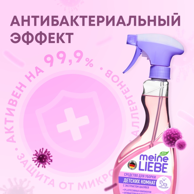 Спрей для детских комнат разработан с учетом безопасности и здоровья ребенка. Средство обладает антибактериальным эффектом и содержит экстракт шалфея, обеспечивающий средству легкий приятный аромат. Вы можете быть уверены, что поверхности, с которыми соприкасается ваш ребенок, будут идеально чистыми. Состав средства включает деминерализованную воду, что обеспечивает дополнительную безопасность при использовании в доме с детьми.Безопасная формула для дома и человека Бытовая химия Meine Liebe производится по уникальной формуле под контролем качества компании Grunlab (Германия), что гарантирует их надежность, эффективность и безопасность. Состав и упаковка средств биоразлагаемые, не содержат хлора, фосфатов, фосфонатов не загрязняют окружающую среду и полностью соответствуют ЭКО-стандартам. Чистящие средства также подходят для домов с автономными канализациями(септиками), что делает их идеальным решением для загородных домов и дач.