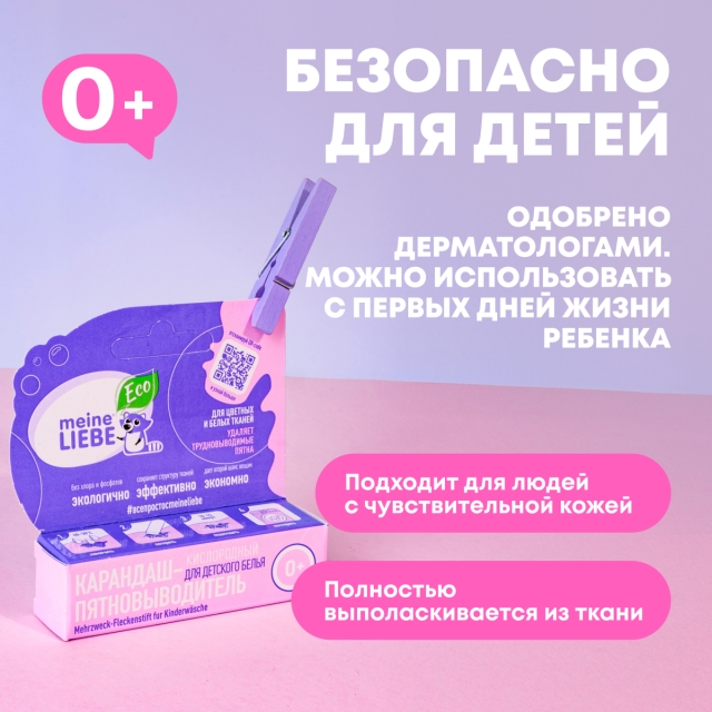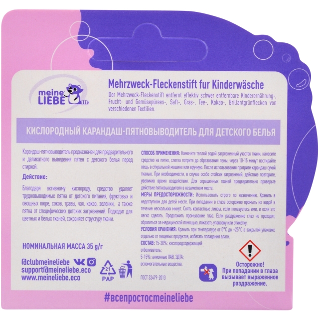 Экологичный, гипоаллергенный карандаш пятновыводитель Майне Либе для детского белья – это эффективное, многофункциональное средство для удаления всех видов пятен и предварительной обработки цветных и белых тканей. Кислородный отбеливатель в формате стика без следа удаляет загрязнения (в том числе застарелые), разрушая структуру пятна, а молекулы ПАВ удаляют частицы загрязнения с вещи в процессе стирки. Благодаря поверхностному способу удаления, процесс безвреден для окрашенных и деликатных изделий, бережен к тканям.