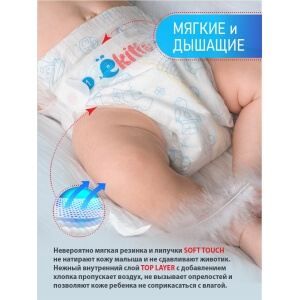 Нежные липучки не раздражают кожу и надежно удерживают подгузник