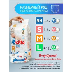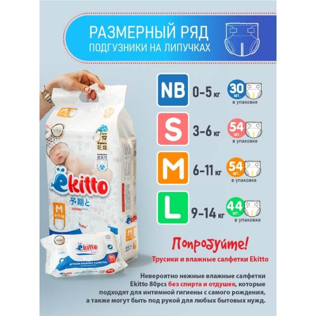 Подгузники EKITTO изготовлены из гипоаллергенных материалов японского качества. Супер мягкая дышащая внутренняя поверхность. Абсорбент Сумитомо мгновенно впитывает жидкость и превращает влагу в гель. Супер мягкий внешний слой с добавлением хлопка позволяет коже ребенка дышать. Двойной впитывающий слой состоит из целлюлозного пуха Weyerhauser и впитывающей бумаги Сумитомо и Сандия. Двойные резиночки у ног. Мягкие застежки не натирают кожу малыша. Индикатор наполнения сообщает о необходимости поменять подгузник. Текстура поверхности подгузников EKITTO эффективно сдерживает мягкий стул. До 12 часов сухости в подгузниках EKITTO.