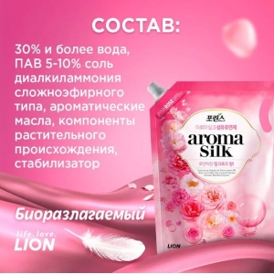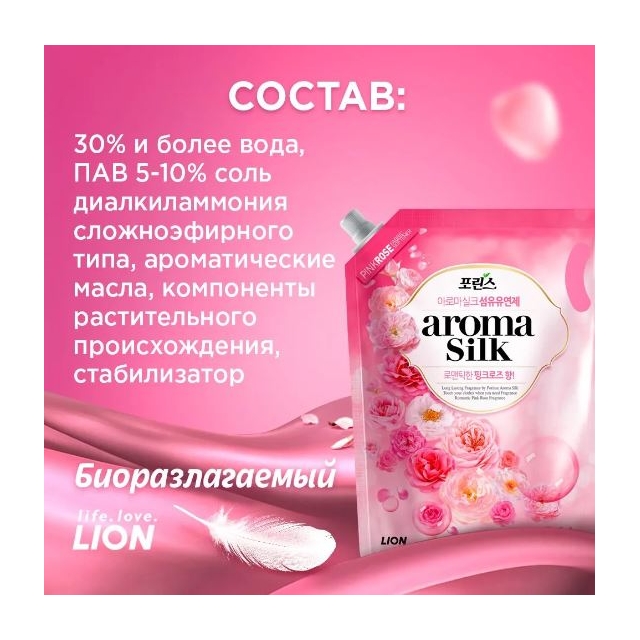 Описание: Кондиционер для белья LION «Роза» в мягкой упаковке объемом 2100 мл наделит Ваши вещи нежным и стойким цветочным ароматом розы. Это смягчающее средство эффективно ликвидирует неприятные запахи, такие как запах пота и табака, благодаря дезодорирующему составу на основе натуральных ароматических масел.