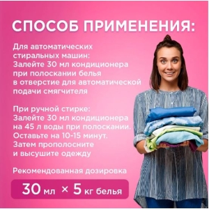 - Для стиральной машины: Залейте 30 мл кондиционера в отсек для автоматической подачи смягчителя при полоскании белья.