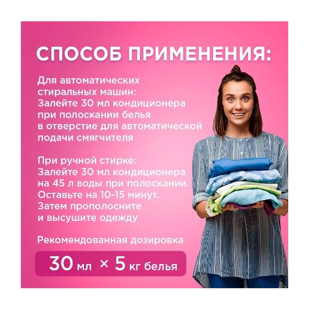 - Для ручной стирки: Добавьте 30 мл кондиционера на 45 л воды при полоскании. Оставьте на 10-15 минут, затем прополосните и высушите одежду.