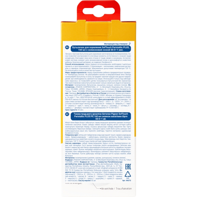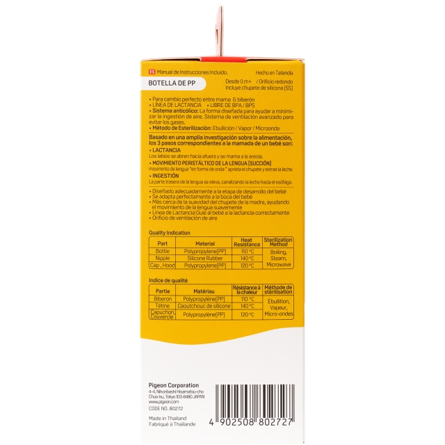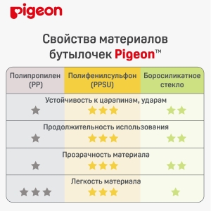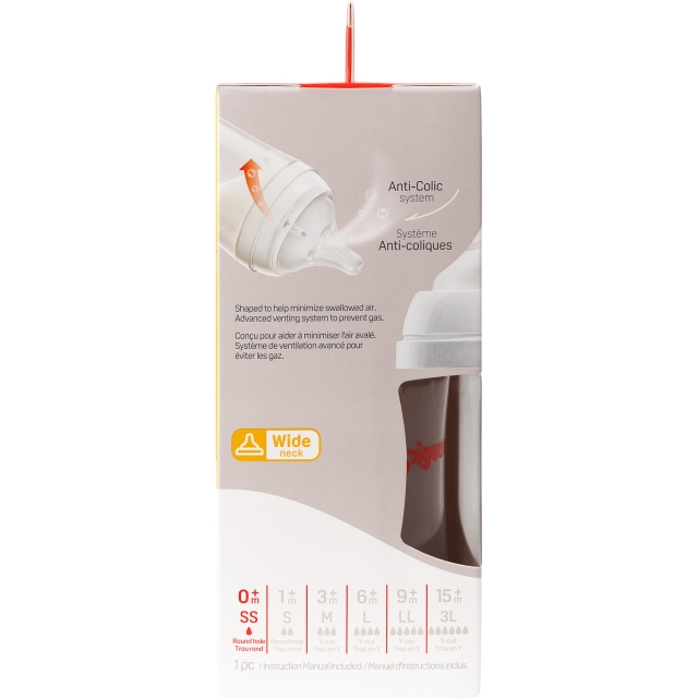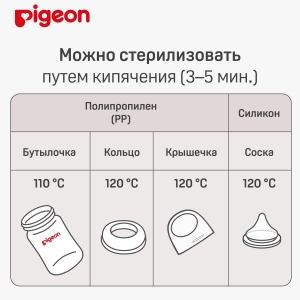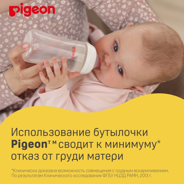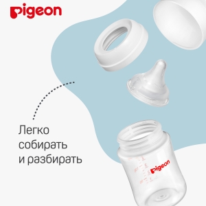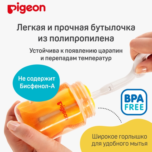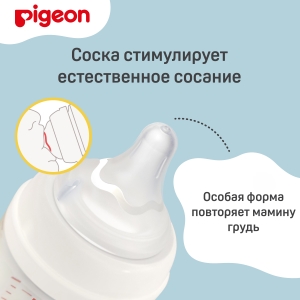 Бутылочка для кормления с физиологической соской разработана специально для грудных младенцев на основе научно-практических исследований лаборатории Pigeon. Создана в поддержку грудного вскармливания. Не вызывает путаницы сосков. Уникальная конструкция соски позволяет воспроизводить естественные механизмы сосания груди матери. Прошла клинические исследования (НЦЗД РАМН, 2013г.). Соска изготовлена из очень мягкого, эластичного и плотного силикона, уникальная конструкции соски стимулирует естественное сосание. Матовая текстурированная поверхность способствует надежному захвату соски. Размер отверстия соски соответствует этапу развития ребенка, в комплекте с соской (размер SS, 0-1 мес.). Запатентованная вентиляционная система способствует равномерному поступлению молока. Снижает риск возникновения колик. Эргономичная форма бутылочки, широкое горлышко позволяет легко промыть бутылочку.