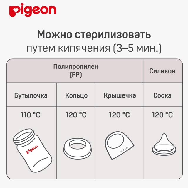 Способ стерилизации: Все части можно стерилизовать путем кипячения (3-5 мин.), в паровом стерилизаторе (следуйте инструкции стерилизатора), в СВЧ-печи (с использованием специальных приспособлений для стерилизации), а также с помощью специальных химических средств. Не используйте нейлоновый ершик для очищения бутылочек из пластика.