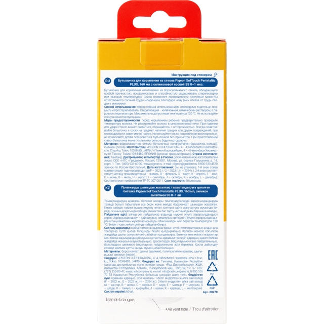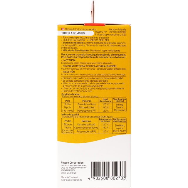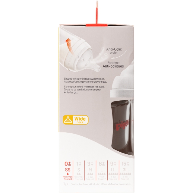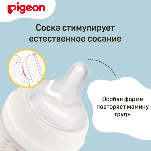 Бутылочка для кормления с физиологической соской разработана специально для грудных младенцев на основе научно-практических исследований лаборатории Pigeon. Создана в поддержку грудного вскармливания. Не вызывает путаницы сосков. Уникальная конструкция соски позволяет воспроизводить естественные механизмы сосания груди матери. Прошла клинические исследования (НЦЗД РАМН, 2013г.). Соска изготовлена из очень мягкого, эластичного и плотного силикона, уникальная конструкции соски стимулирует естественное сосание. Матовая текстурированная поверхность способствует надежному захвату соски. Размер отверстия соски соответствует этапу развития ребенка, в комплекте с соской (размер SS, с рождения ). Запатентованная вентиляционная система способствует равномерному поступлению молока. Снижает риск возникновения колик. Эргономичная форма бутылочки, широкое горлышко позволяет легко промыть бутылочку. Бутылочка изготовлена из прочного премиального боросиликатного стекла, устойчивого к перепадам температур. Не содержит Бисфенол-А.