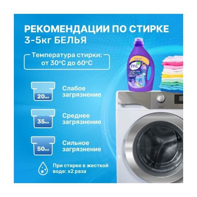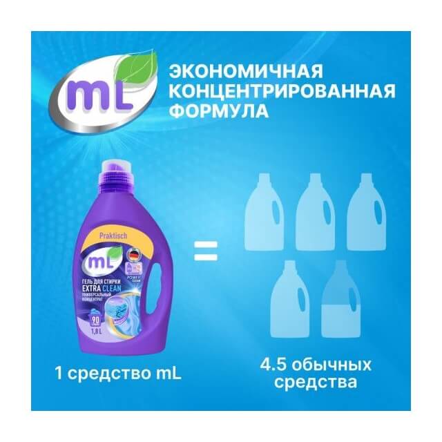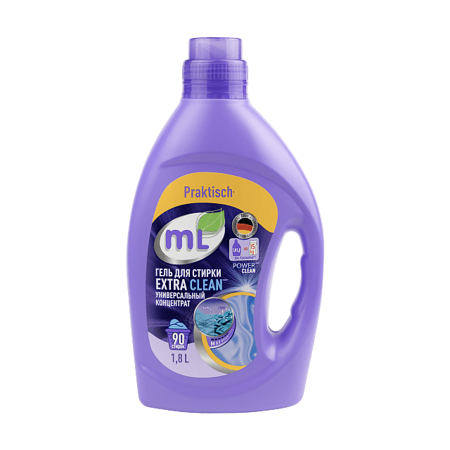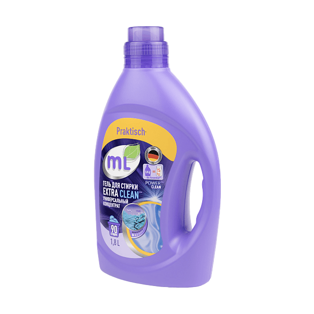 Универсальный гель-концентрат для стирки цветного и белого белья mL EXTRA CLEAN, 1,8 л., разработанный под контролем немецкой фабрики бытовой химии GruenLab, подходит стирки вещей в воде любой жесткости и температуры от 30 до 60°С.