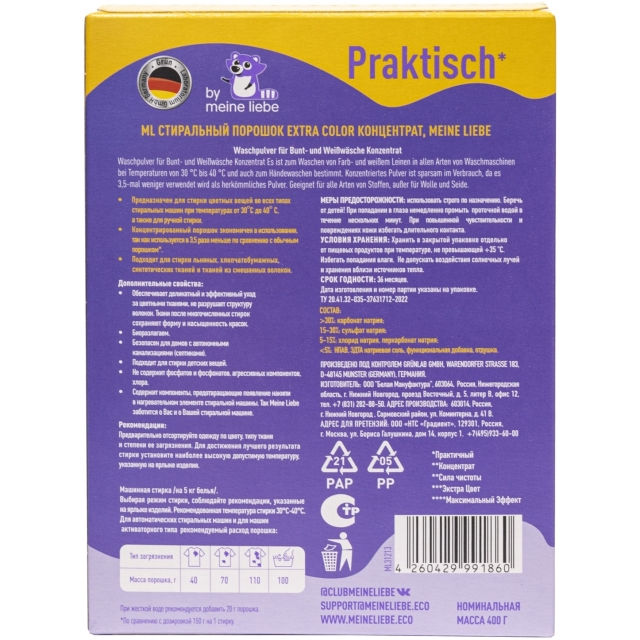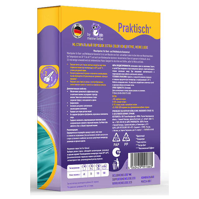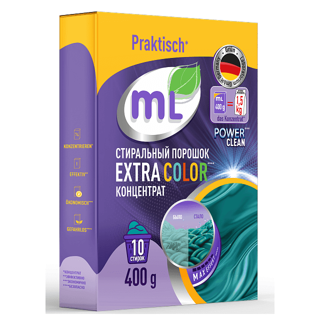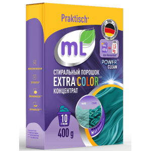 Стиральный порошок-концентрат для цветного белья mL EXTRA COLOR, 400 г., разработанный под контролем немецкой фабрики бытовой химии GruenLab, подходит стирки вещей в воде любой жесткости и температуры от 30 до 60°С.
