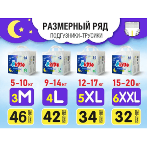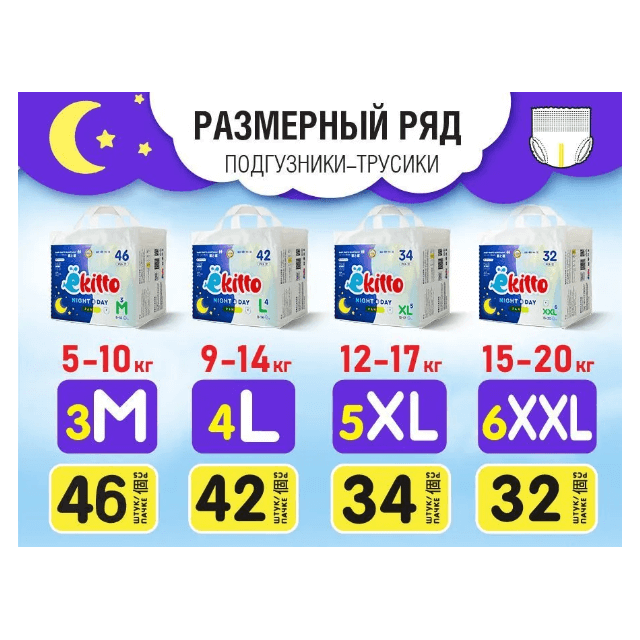 Подгузники-трусики EKITTO Night-Day XL34 12-17 кг
