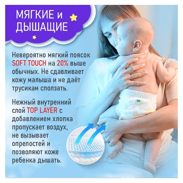 Благодаря эластичному пояску вся жидкость остается внутри трусиков, а новый супер-дышащий слой быстро распределяет влагу и не дает ей слеживаться. Оборочки вокруг ног и вкладыш top layer с добавлением дышащего хлопка предотвращают протекание. Индикатор наполнения даст вам понять, когда пришло время менять трусики.