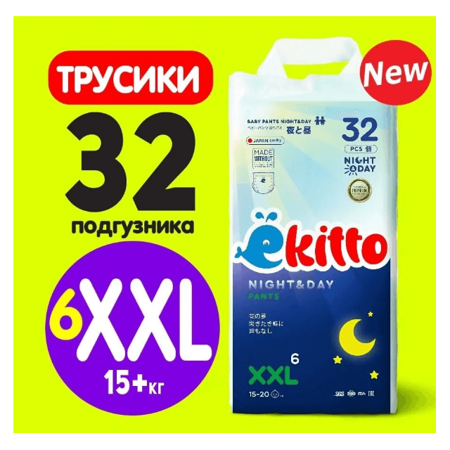 Подгузники-трусики EKITTO Night-Day XXL32 15-20 кг