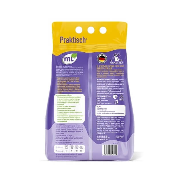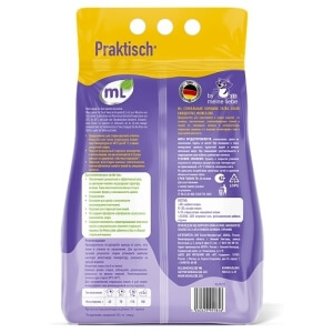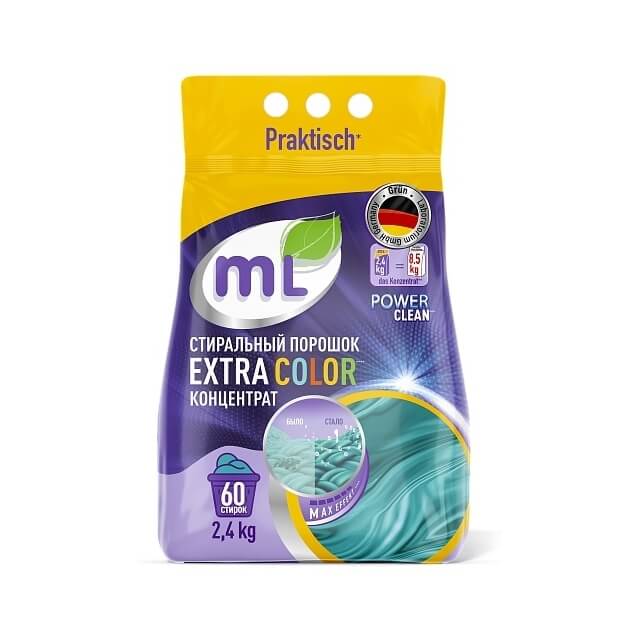 Стиральный порошок-концентрат для цветного белья МL EXTRA COLOR, 2,4 кг., разработанный под контролем немецкой фабрики бытовой химии GruenLab, подходит стирки вещей в воде любой жесткости и температуры от 30 до 60°С. Порошок-концентрат эффективно отстирывает загрязнения как в холодной, так и горячей воде, а также используется для стирки как в стиральной машине автомат, так и для ручной стирки. Порошок для стирки цветного mL Extra Color содержит в себе компоненты, которые защищают цвет даже после многочисленных стирок, отстирывают загрязнения в любой воде, подходит для ежедневной стирки, а также бережно относится к ткани. Благодаря формуле-концентрату стирка порошком mL до 3,5 раз более экономична (по сравнению с другими средствами для стирки в линейке Gradient). Средства 2,4 кг хватает до 60 стирок. Стиральный порошок применяется для стирки цветного белья, а также отлично подходит черного белья, темного и светлого белья. Порошок для стирки цветных вещей mL может использоваться для стирки большинства видов тканей, в том числе для стирки повседневной одежды из хлопка, полиэстера, а также для стирки тканей, требующих особого ухода, в том числе детской одежды и нижнего белья. Стиральный порошок mL EXTRA COLOR концентрат обладает приятным свежим ароматом, который устраняет неприятный запах и освежает ткань надолго.