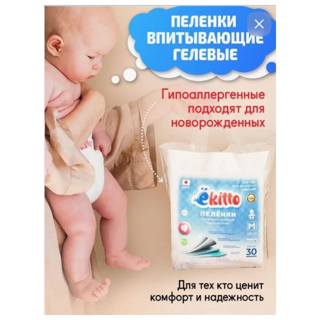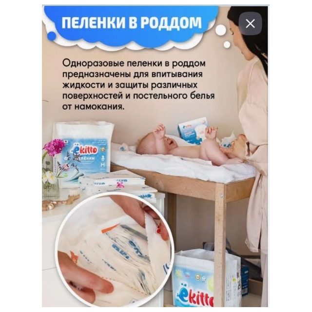 Одноразовые впитывающие пеленки Ekitto предназначены для защиты постельного белья, ухода за новорожденными, проведения медицинских и гигиенических процедур, для домашних питомцев..- 1. Мягкая поверхность обеспечивает нежное и деликатное прикосновение к коже.- 2. Впитывающий слой содержит суперабсорбент для лучшего впитывания влаги.- 3. Защитный слой полиэтилена предотвращает протекание.- Впитывающие пеленки имеют поверхность из мягкого фильтрующего нетканого материала, благодаря которому кожа остается сухой, без раздражений. Внутренний слой состоит из распушенной целлюлозы, которая впитывает запахи и влагу. Высокие показатели впитываемости достигаются за счет добавления суперабсорбента (SAP), который превращает влагу в гель.- Материалы, используемые в производстве, безопасны для здоровья.- Одноразовые пеленки имеют повышенную влаговпитываемость, гарантируют надежную защиту и максимальный комфорт.- Доступные размеры: 60х40 см