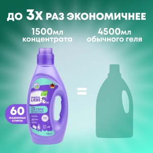 Средства для стирки Meine Liebe не требуют предварительного замачивания и предотвращают появление накипи, а концентрированной формулы хватит на 60+ стирок при полной загрузке машинки на 4-5 кг сухого белья, что более чем в три раза экономичнее обычного геля. Удобный эргономичный флакон с двойным колпачком обеспечивает безопасность использования и предотвращает пролитие средства.