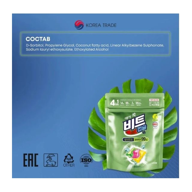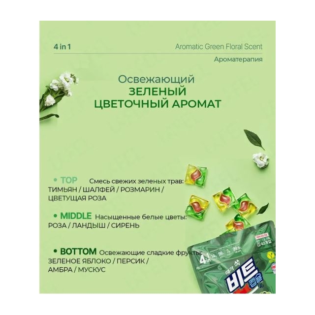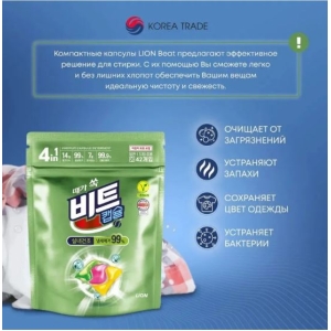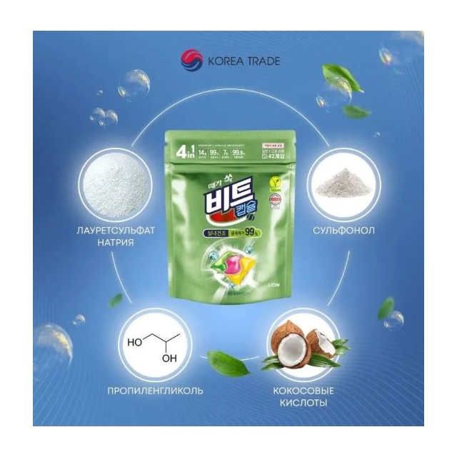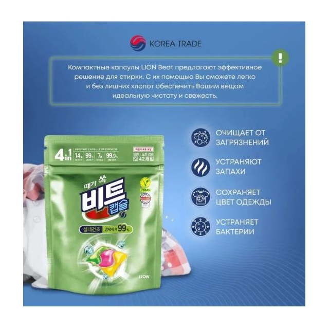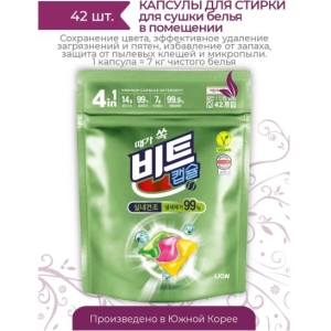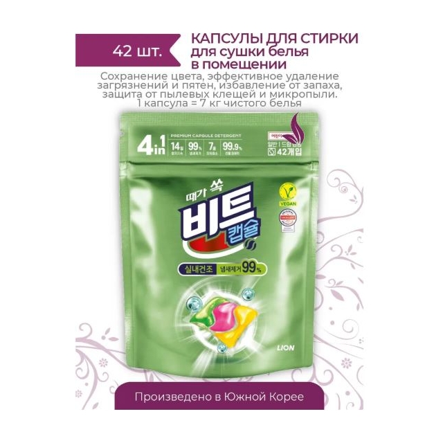 Инновационное моющее средство в форме капсулы, разработано для эффективной стирки и последующей сушки белья в помещении. Уникальный состав капсулы гарантирует бережную очистку от различных видов загрязнений благодаря формированию активной пены. Мягкие и безопасные ПАВы легко растворяются в воде и не вызывают аллергических реакций. За счет хорошей растворимости не оставляет следов моющего средства на ткани и не требует дополнительного полоскания. Не теряет своей эффективности даже при стирке в холодной воде. Способ применения: достаньте капсулу с упаковки и положите ее на дно барабана для того, чтобы вода ее растворила. Поверх капсулы загрузите в барабан стиральной машины загрязненное белье. Запустите стирку.