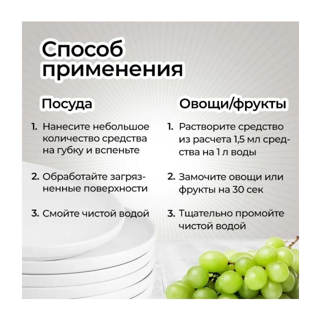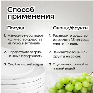 Способ применения: Нанесите небольшое количество средства на губку, намылите посуду и тщательно смойте.
