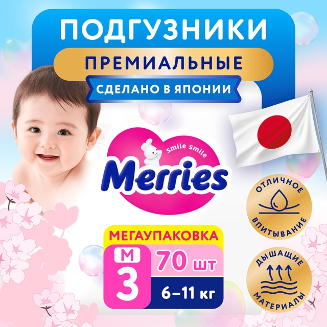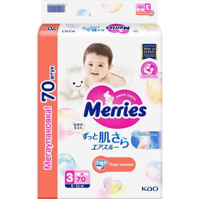 MERRIES Подгузники для детей размер M 6-11кг/ 70шт