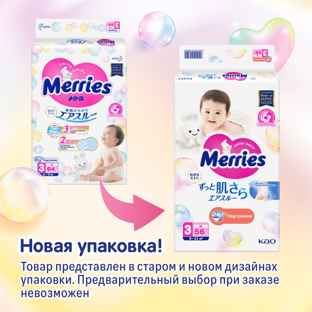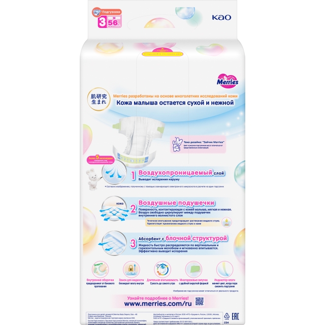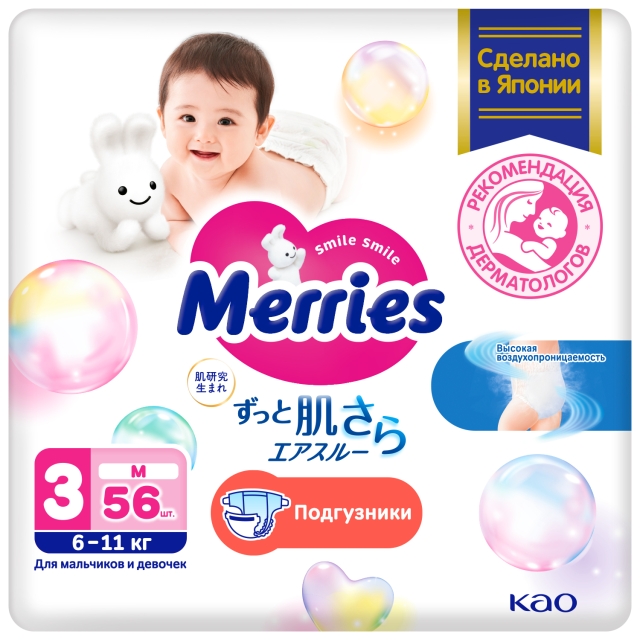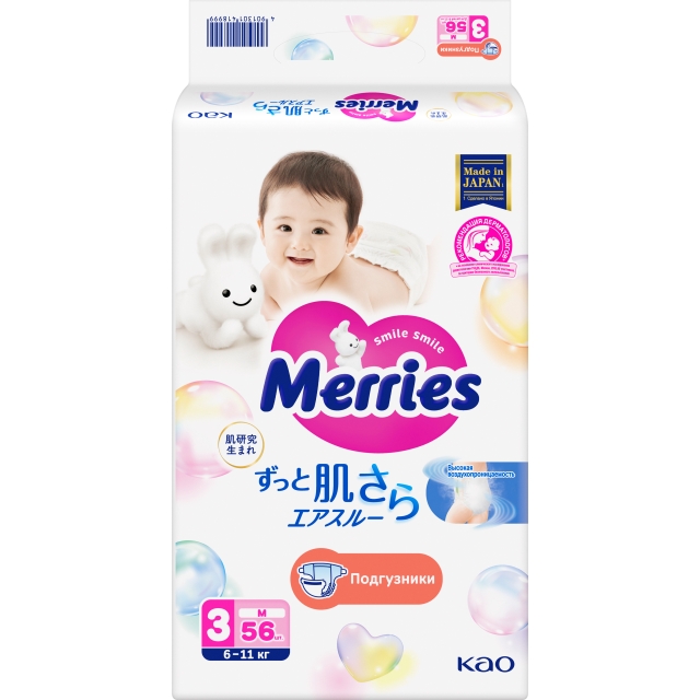 Отличительной особенностью подгузников Merries является способность выводить влажный воздух из подгузника, комфортно прилегающего к коже ребенка.