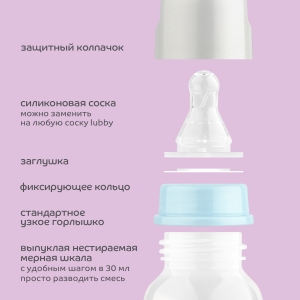 Бутылочка Lubby объёмом 125 мл предназначена для кормления новорождённых с первых дней жизни. Оборудована силиконовой молочной соской медленного потока и выполнена из безопасного, лёгкого и прочного полипропилена. Идеальна для ежедневного использования и поездок.