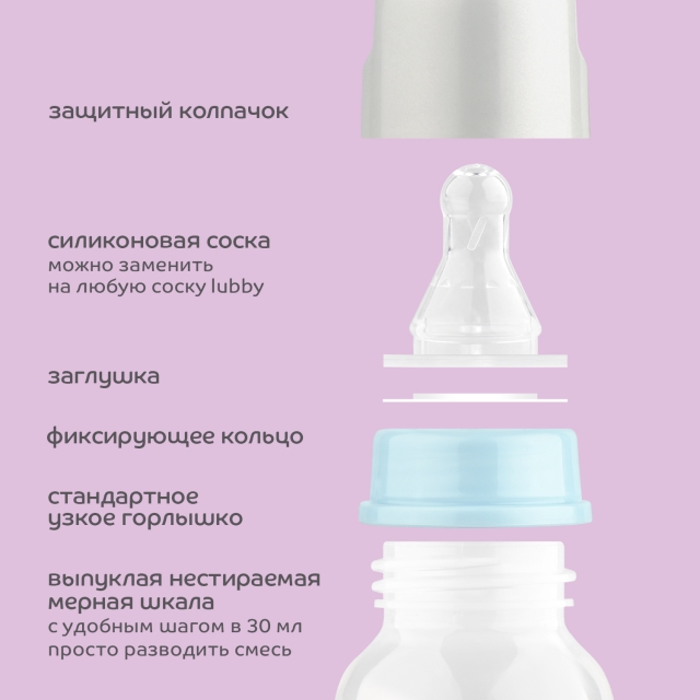 Совместимость с сосками Lubby для стандартного (узкого) горлышка (латекс и силикон)