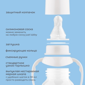 Удобная и безопасная бутылочка Just объёмом 125 мл со стандартным (узким) горлышком и силиконовой соской медленного потока идеально подходит для малышей с рождения. Лёгкая, прочная, оснащена съёмными ручками — ребёнок сможет самостоятельно держать бутылочку во время кормления.Преимущества: