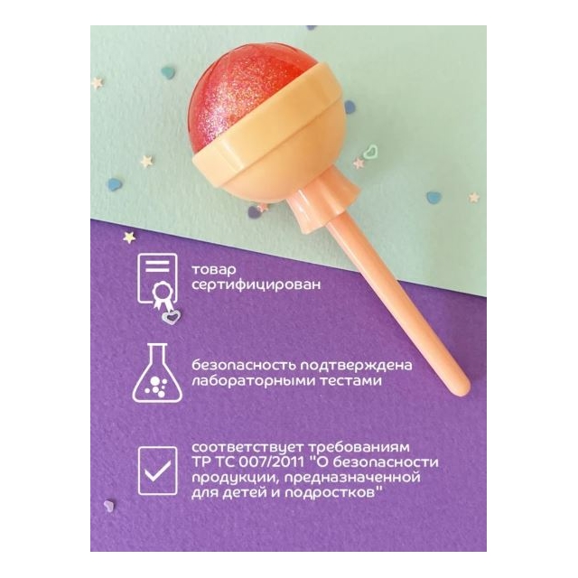 Блеск для губ детский с ароматом Сладкого персика легко наносится на губы, не оставляя ощущения липкости или жирности, только качественная по составу косметика. Он создает эффект легкого сияния, увлажняет губы и смягчает их, защищая от обветривания. Покрытие блеска для губ прозрачное с нежным оттенком и яркими блестками, которые сверкают как звездочки на губках маленькой принцессы. Этот детский блеск прошёл испытания сертификации на использование для детей от 3-х лет, что особенно важно для безопасности здоровья вашего ребёнка и правильного ухода для губ. Дизайн такого бальзама для губ с оттенком по-настоящему удивляет, ведь это настоящий chupa chups на палочке со вкусом персика и легким шиммером.