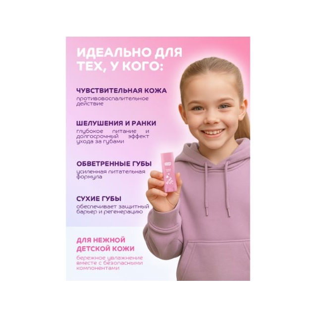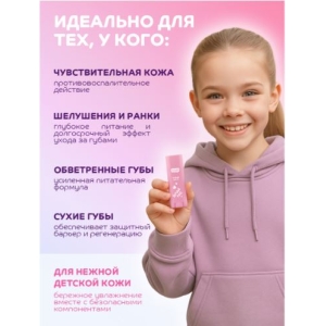Этот детский бальзам для губ с ароматом карамелек — просто вкусняшка, которую хочется съесть! Его привлекательный дизайн точно понравится детям, а в составе только лучшие компоненты — масло миндаля, кокосовое масло, масло жожоба, облепиховое масло, масло ши, витамин Е, Д-Пантенол и пчелиный воск. Забота о губках и стиль в одном флаконе!