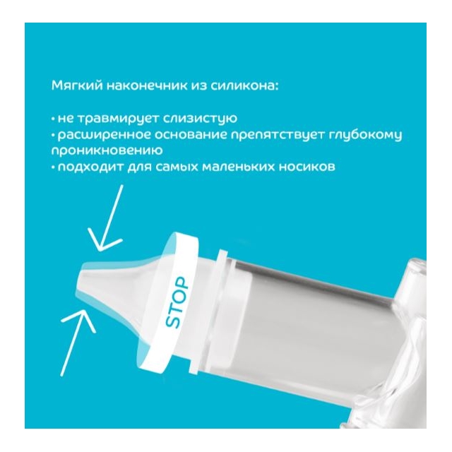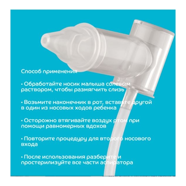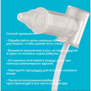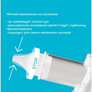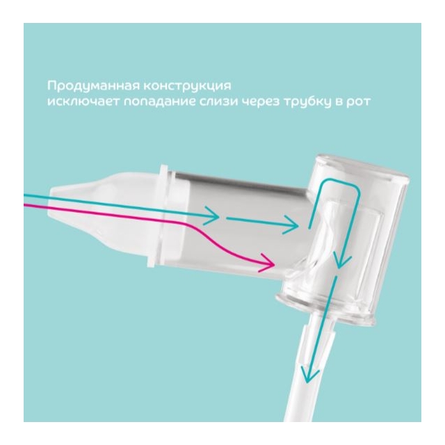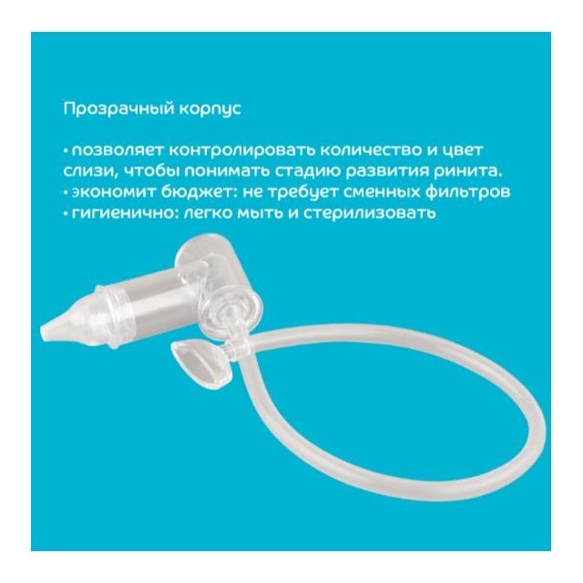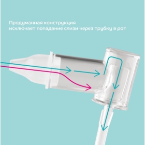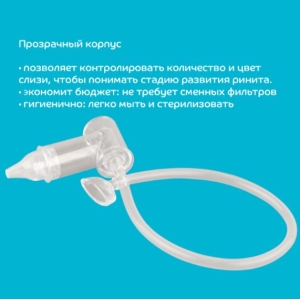 Конструкция аспиратора позволяет регулировать интенсивность откачивания и исключает попадание слизи в рот взрослого. Прозрачность камеры позволяет визуально контролировать процесс отхождения слизи и зафиксировать цвет слизи, чтобы понимать стадию развития ринита. Это очень важно для диагностики и мониторинга заболевания. Не требует сменных фильтров.- мягкий силиконовый кончик