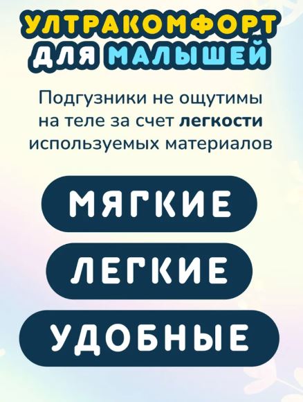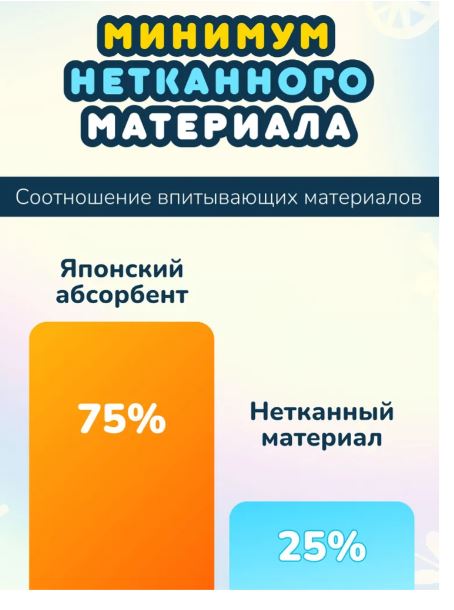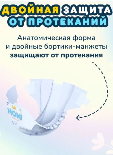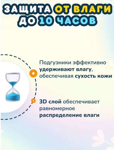 - Мгновенное впитывание: Подгузники быстро поглощают влагу и надежно удерживают её внутри.