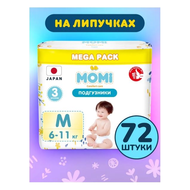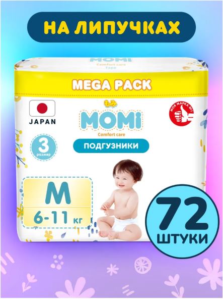 Подгузники MOMI Comfort Care Mega Pack M (6–11 кг), 72 шт